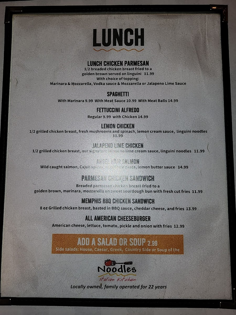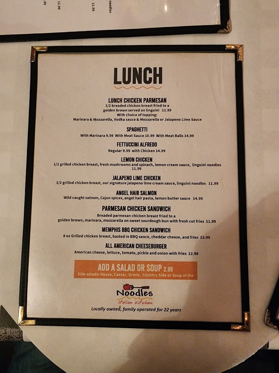 Noodles Italian Kitchen offers a menu that blends comforting Italian classics with a few distinctive twists, creating a relaxed dining experience that fits well for casual lunches, family dinners, or gathering with friends. The menu is approachable and varied, featuring dishes that range from hearty pastas like Lasagna Bolognese and Chicken Alfredo to lighter fare such as fresh Caesar salads and grilled salmon options.