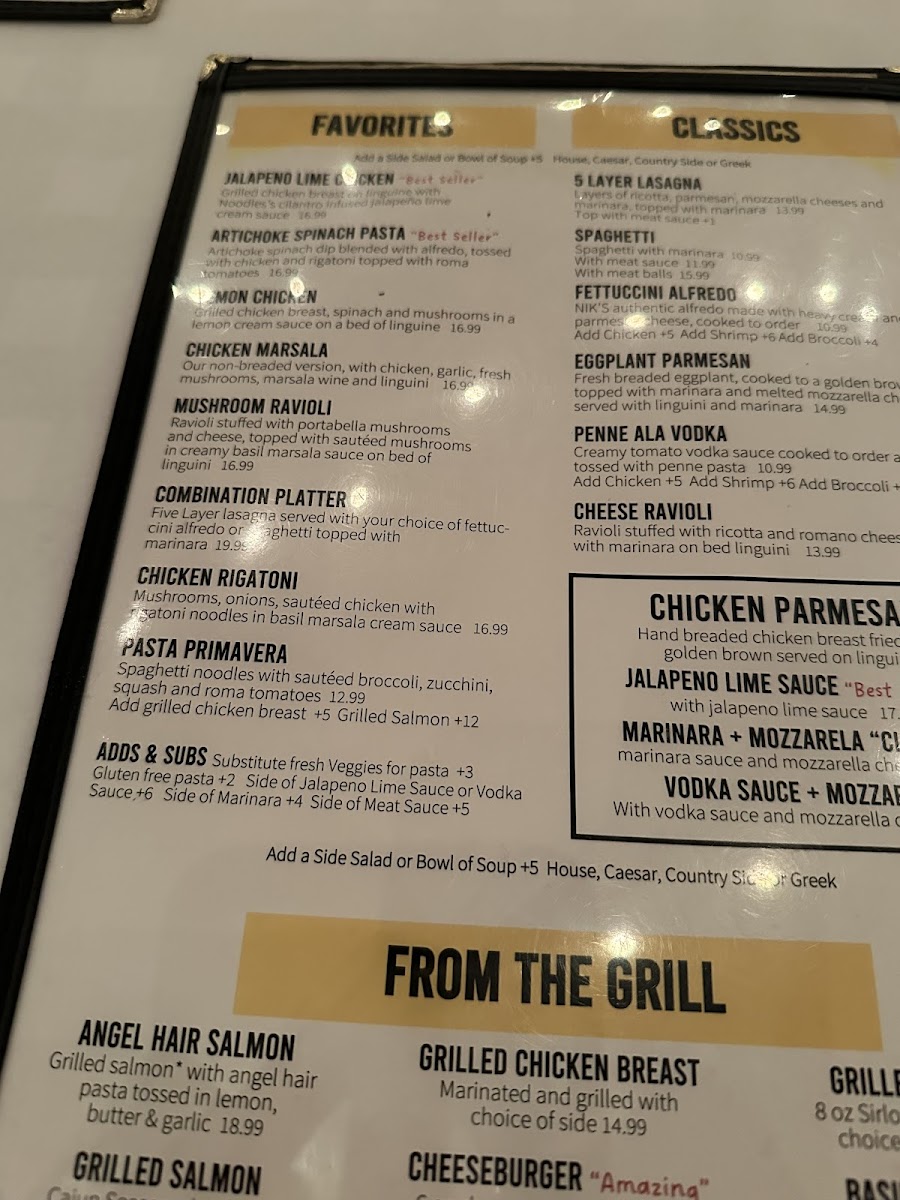 Start your meal with simple, flavorful appetizers like Bruschetta Classica or Toasted Ravioli, perfect for sharing and setting a welcoming tone. During lunch or dinner, favorites like the Jalapeño Lime Chicken and Mushroom Ravioli provide satisfying, balanced plates that suit everyday enjoyment without feeling heavy. The menu also includes comforting pasta dishes like Chicken Marsala or Artichoke Spinach Rigatoni, which pair naturally with the cozy yet open atmosphere of the restaurant.